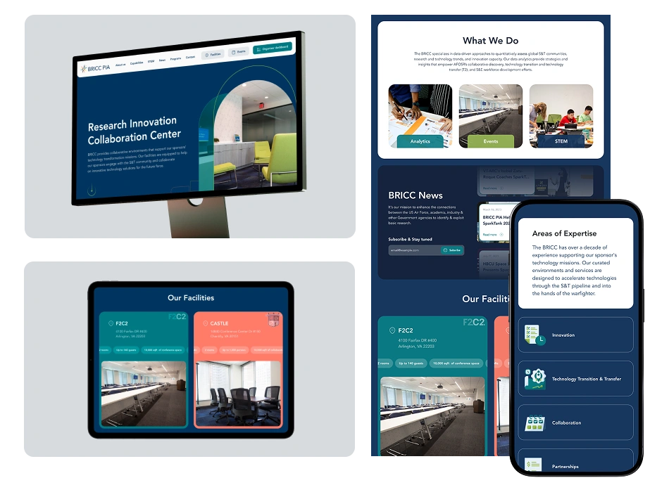 We partnered with Virginia Tech’s BRICC PIA to build a comprehensive website and custom portal that showcases their research collaborations and technological innovation. The platform includes a web application that allows users to register and manage events, book facilities, and handle attendance tracking. It was developed to serve both visitors and internal teams coordinating complex event logistics.