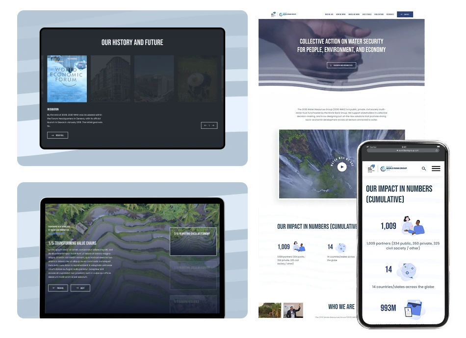 We developed a full-scale, multilingual platform for the World Bank’s 2030 WRG to showcase water sustainability initiatives and global partnerships. The site features dynamic infographics, a fully interactive global projects map, and a custom WordPress CMS that allows the team to easily manage a large and evolving library of reports, data, and updates.